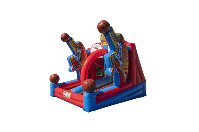 The inflatable’s bright blue, red, and yellow colors make it a vibrant centerpiece for any party. Fun decorative details include two small inflatable basketballs at the shooting stations and graphics of a basketball payer in action on the sides, giving it the feel of a mini basketball arena.